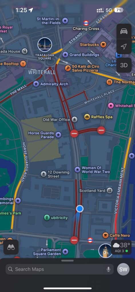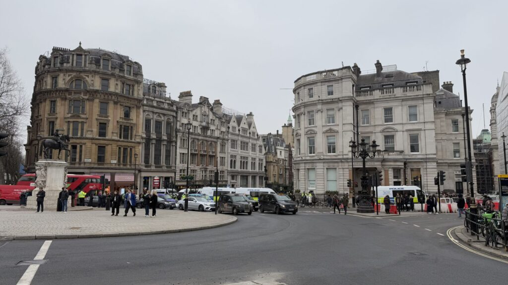 Once we got to Trafalgar Square, we were surprised to see the number of police in the area. This had been a discussion earlier at that palace that there were only a handful of officers in the area, and they were soooo helpful! Giving directions, helping people orient themselves, etc. So, to have multiple cars and dozens of police here started to feel odd… so we went to take a look and see what was going on π.